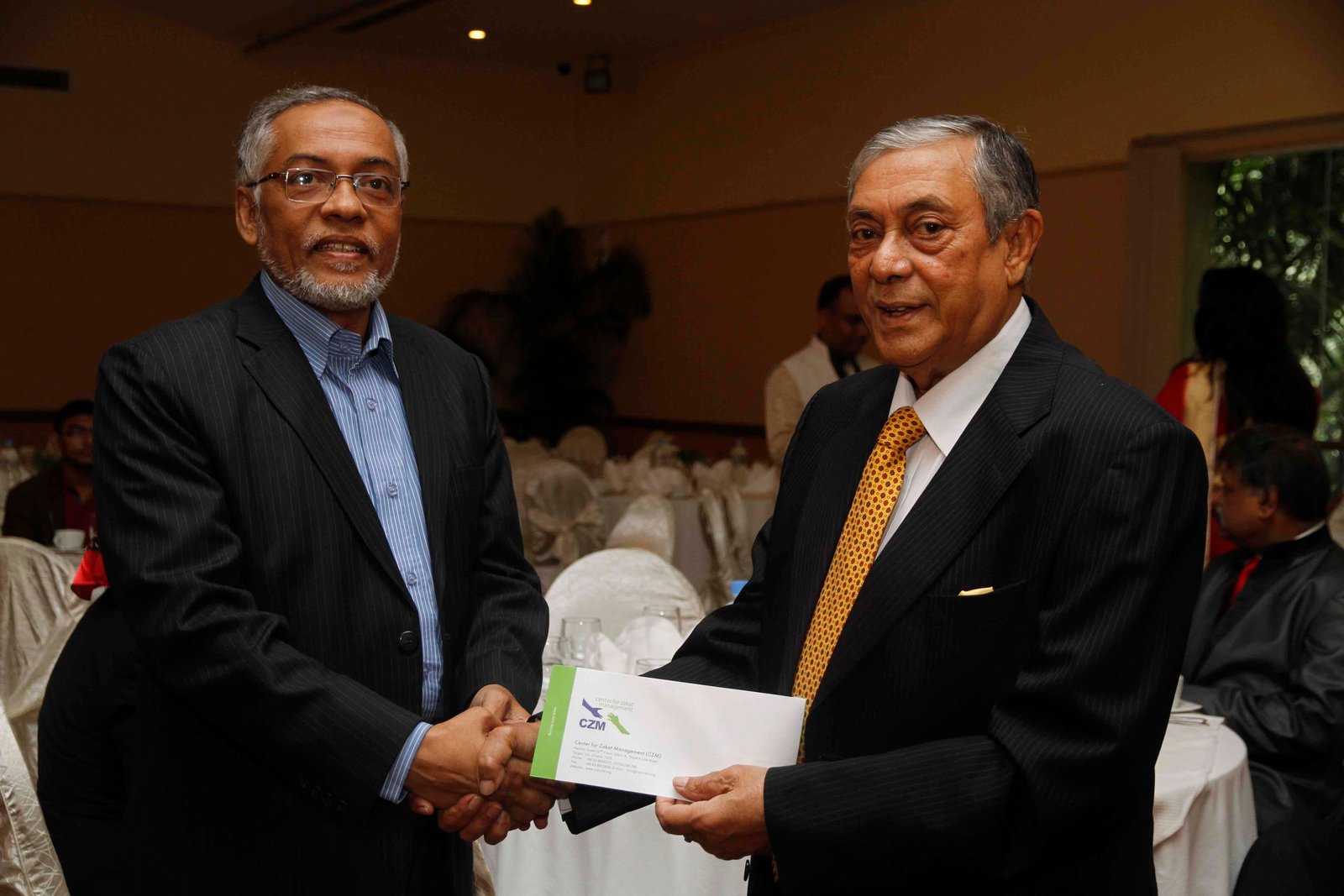 Dr. Mohammad Ayub Miah, General Secretary of Center for Zakat Management handing over scholarships for visually impaired students to the President of Institute of Hazrat Mohammad (SAW).